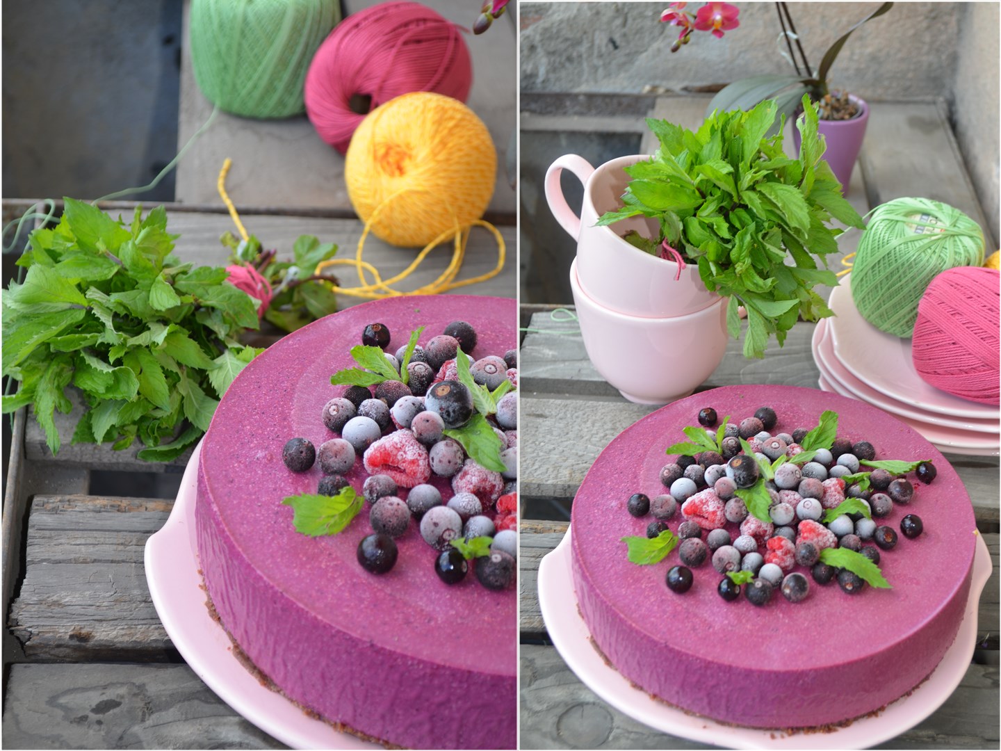 Фіолетову сирну масу викладаємо на корж з печива, розрівнюємо і ставимо мінімум на чотири години в холодильник. Прикрашаємо як лише спаде на думку. Я вирішила не дуже мізкувати з цим, а просто висипала на серединку заморожені ягоди смородини та малини – ідеальний декор для супер ягідного чізкейка.