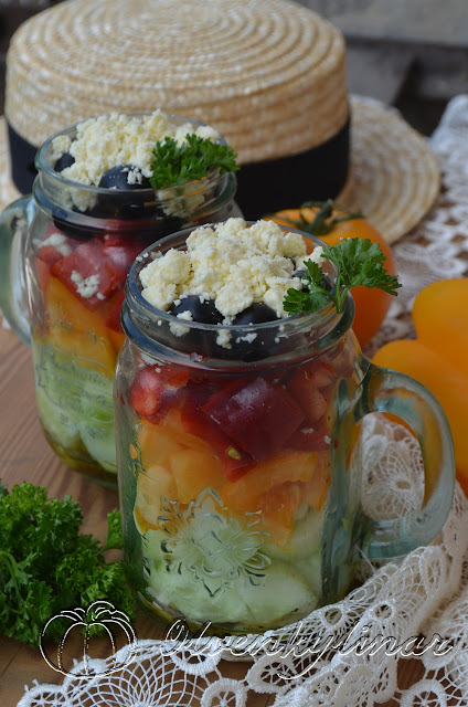 В такій інтерпретації Грецький салат зазвучав по-новому: оригінально та незвично. Думаю, такою подачею ви зможете здивувати своїх гостей чи домашніх. А ще дуже зручно транспортувати таку смакоту куди завгодно. Саме за це люблю такий чудовий тренд.
