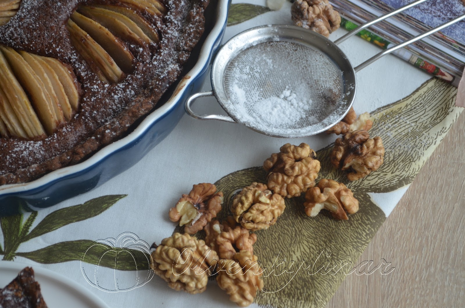 Інгредієнти. Тісто: 200 г борошна, 100 г масла, 10 г какао, 1 яйце, 50 г мелених грецьких горіхів, 50 г цукру, 50 г сметани, дрібка солі. Начинка: 4-5 груш середнього розміру, лимонний сік, 70 г цукру, 50 г м'якого масла, 2 яйця, 100 г змелених горіхів, 2 ч. л. з гіркою какао.